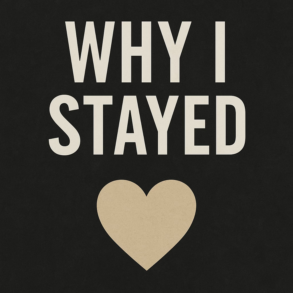 Interpretation: The minimalist heart beneath the stark phrase reflects the emotional complexity of staying in an abusive relationship—not out of blindness, but out of calculation, compassion, and fear. The contrast of soft symbol and sharp type echoes the tension between intention and reality.